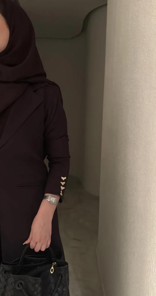 تفاصيل العباية: بليزر عبايه جيوب من الامام ، الاكمام مزينه بفراشات ذهبي ومن الامام ايضاً ، من الخلف فتحه صغيره .