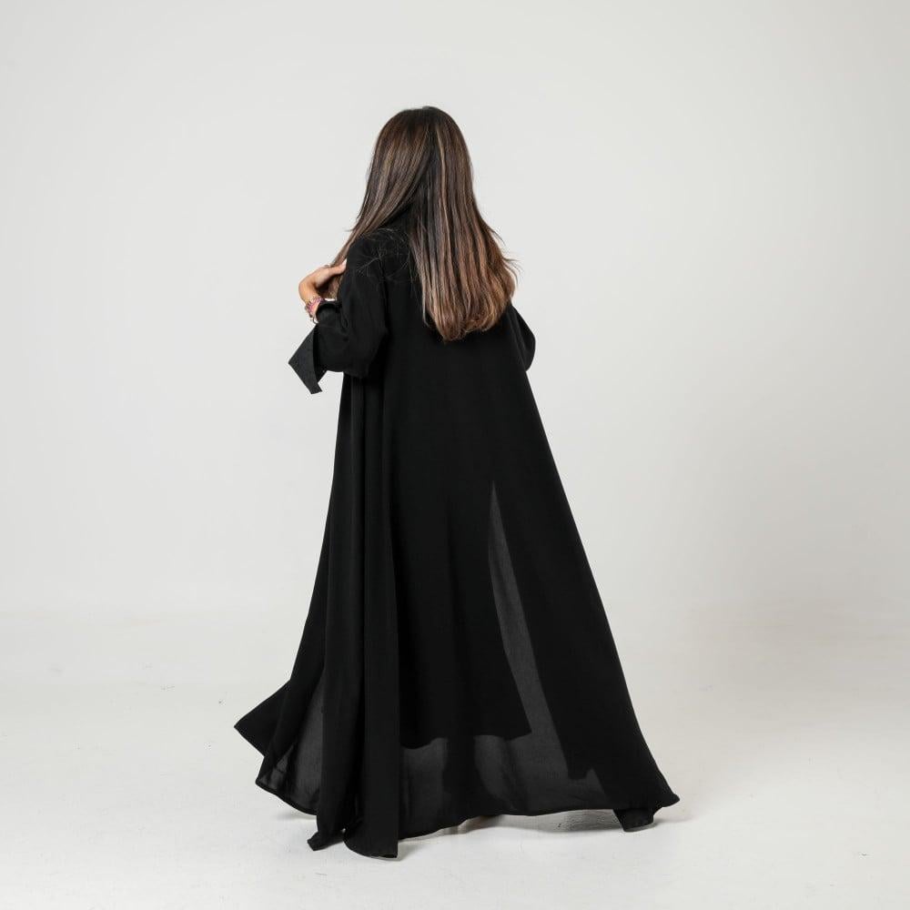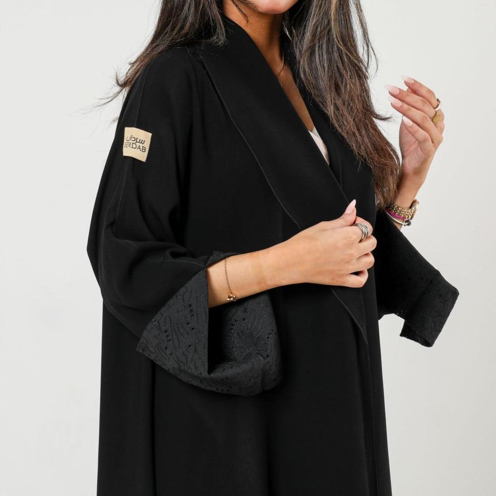 هل تبحثين عن عباية عملية للدوام او للطلعات والتسوق ؟ متجر رغد يقدم لك عباية سوداء مُنسوجة من قماش الكريب والراكه المخرم، عباية تلائم ايضا المناسبات الرسمية، مصممة بشكل أنيق من الكريب مع اضافة الراكة المخرم على الاكمام.
