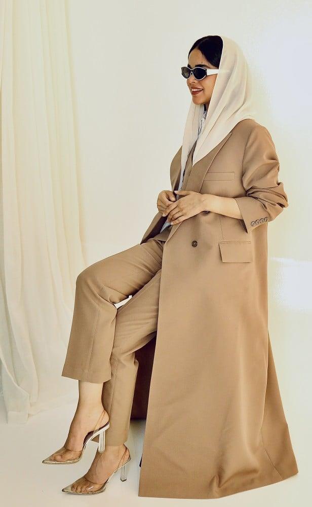 أنيقة بقصة عصرية بقماش الكتان الفاخر مبطنة بقماش البونجيه مع خياطة داخلية وجيوب امامية و فتحة من الخلف و كتافات اسفنج وازره باللون البني