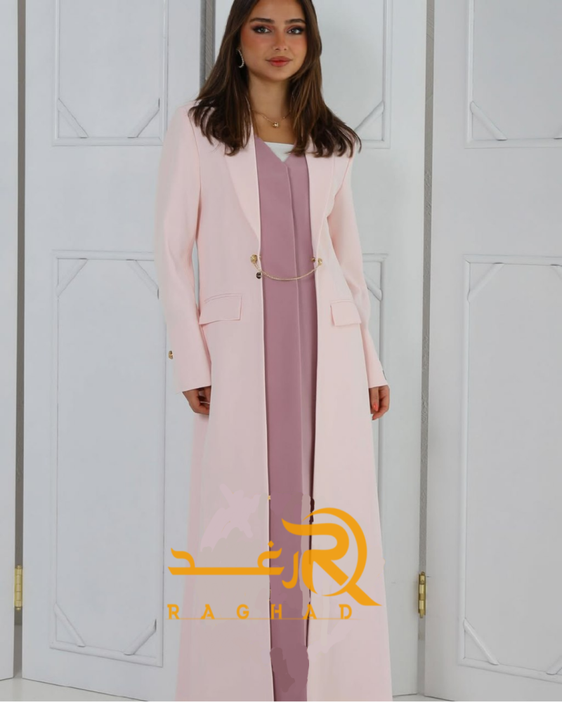 ابدئي يومك بلمسة ناعمة وسط صخب الحياة مع عباية البليزر الصيفية باللون الوردي الفاتح الرائج لصيف 2025 وقماش الكريب عالي الجودة